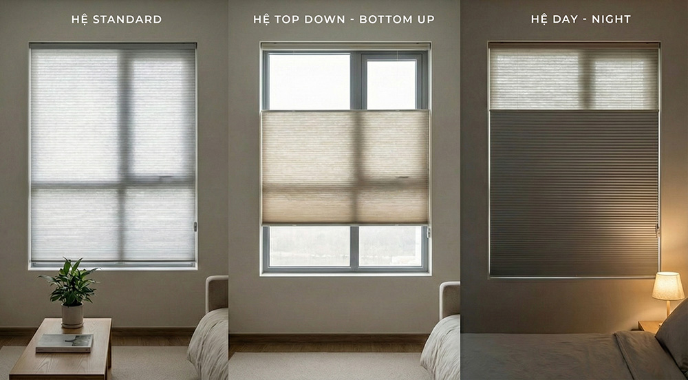 - Hệ vận hành: rèm top down, rèm tổ ong 2 lớp Day Night, hoặc cấu hình khác.