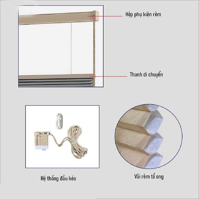 - Cấu tạo: Rèm gồm vải rèm hình tổ ong, thanh ray cố định (trên cùng), thanh di động 1 (giữa) và thanh di động 2 (đáy).